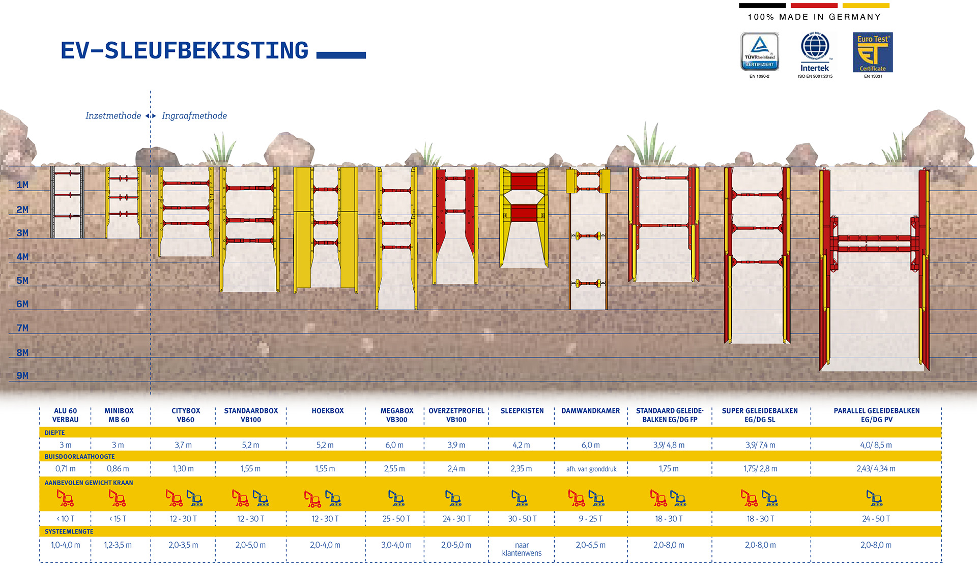De optredende gronddruk wordt door de veerschoenen en de spindels tussen de platen opgenomen. Zo wordt een veilige stabiele in- en uitbouw tijdens het ingraven, aanvullen en verdichten gewaarborgd.